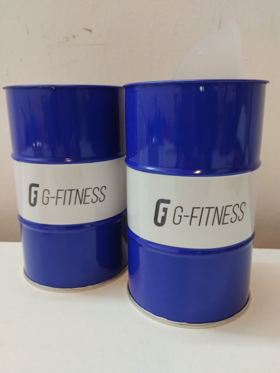 – Set de dos latas azules y blanco 14,5 de alto y 9cm de diámetro con pico vertedor.